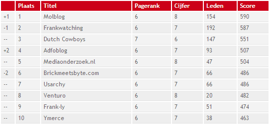 Ook deze maand geen grote verschuivingen in de top 10. Dutchcowboys, Mediaonderzoek.nl, Usarchy, Venturo, Frank-ly en Ymerce blijven op dezelfde plek staan terwijl Adfoblog en Brickmeetsbyte van positie zijn gewisseld.