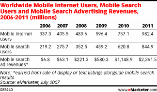 Over de marktomvang van mobiele zoekmachinemarketing lopen de meningen uiteen. Zo meldt eMarketer deze week dat de voorspellingen voor mobile search advertising uiteenlopen van 1,5 miljard dollar in 2011 (door Informa Telecoms & Media) tot meer dan 11 miljard dollar in 2008 (door Piper Jaffray). eMarketer zelf voorspelt voor de wereldwijde markt van mobile advertising (inclusief search) een omzet van 13,8 miljard dollar in 2011. Mobile search zou daar een bijdrage in hebben van 17 procent oftewel 2,4 miljard dollar. Daarbij is men uitgegaan van bijna 1 miljard gebruikers van mobiel internet in 2011 waarvan ruim 840 miljoen gebruikers van mobile search.
