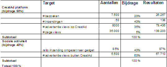 In het afrekenmodel met CreatAd telde dit laatste voor 40 % mee in het behalen van hun target, zoals in onderstaande tabel is weergegeven. De targets zijn in onderling overleg opgesteld.