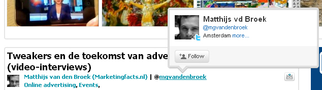 De hovercard met enkele twittergegevens en een follow/unfollow knop komt in beeld zodra je met de muis op de twitternaam of avatar staat. Indien je ingelogd bent in twitter kun je zo direct de persoon bijvoorbeeld gaan volgen.