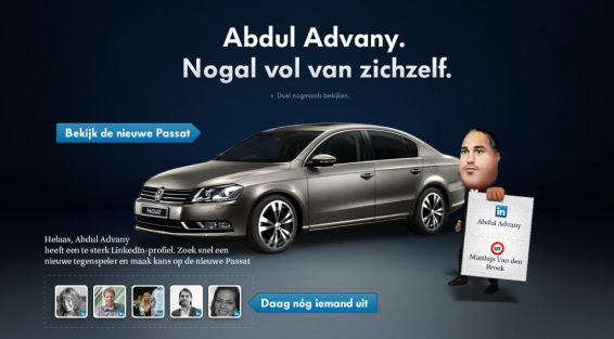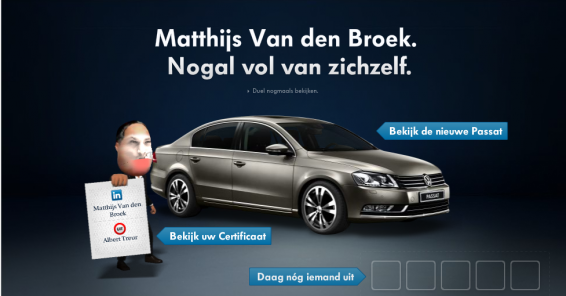 De campagne draait dus om de Volkswagen Passat. De link tussen die auto en het vergelijken van je relaties op LinkedIn in een battle is de volgende. De Volkswagen Passat is nogal “vol” van zichzelf. Ik neem aan dat er bedoeld wordt dat de auto geleverd wordt met standaard boelveel opties. Als je je gaat vergelijken met je relaties op LinkedIn en daarin wint, dan ben je ook nogal “vol” van jezelf. Dus. In het persbericht staat het zo: