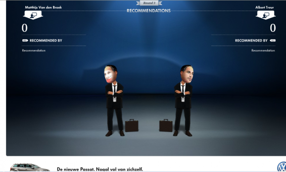 Het is in ieder geval leuk en grafisch mooi gemaakt, en met het social sharen via verschillende platformen is het dik in orde. Er is slim gebruik gemaakt van de API van LinkedIn (volgens ACHTUNG! is het de eerste keer dat een campagne op deze manier via LinkedIn is opgezet) om profielen in een wedstrijd tegenover elkaar te zetten. Ik heb net nog een keer “gespeeld” en verloren van @advany, omdat hij 20x meer recommendations had en iets meer activiteiten in zijn joblist heeft gezet (hij zat waarschijnlijk ook in de redactie van de schoolkrant) 😉