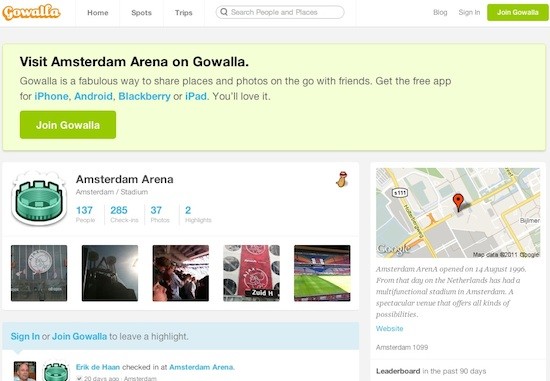 Ook voor Centraal Station Utrecht en Amsterdam Arena is Foursquare de meest populaire checkinapplicatie. Daar waar voor Schiphol de verschillen tussen het aantal checkins via Foursquare en Facebook Places relatief klein is, zien we relatief grote verschillen tussen de checkins voor zowel Centraal Station Utrecht en Amsterdam Arena. Een verklaring hiervoor kan zijn dat Schiphol veel internationale gebruikers kent terwijl Centraal Station Utrecht en Amsterdam Arena vooral Nederlandse gebruikers kent. Op Centraal Station Utrecht tellen we 56.339 checkins via Foursquare, 2.751 checkins via Gowalla en ruim 2.000 via Facebook Places. In Amsterdam Arena tellen we 7.312 checkins via Foursquare, 285 via Gowalla en ruim 1.500 via Facebook Places. Gowalla lijkt daarmee definitief te zijn afgeschreven voor de Nederlandse gebruikers.