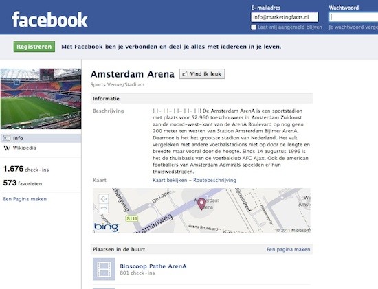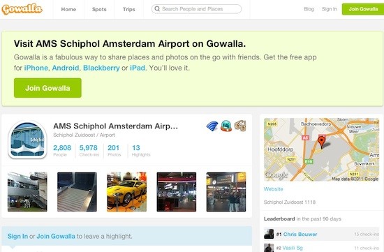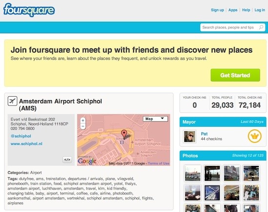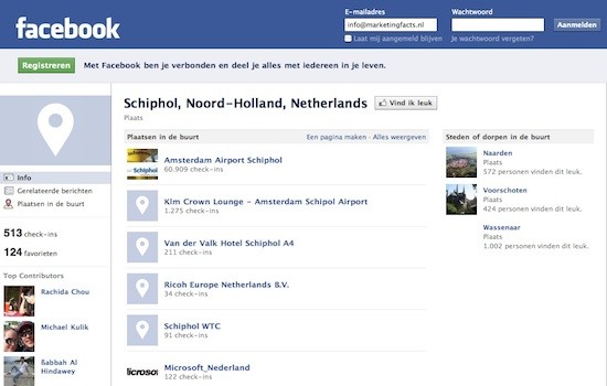 Hoewel het in Nederland nog niet heel lang mogelijk is om gebruik te maken van Facebook Places, lijkt het inchecken via Places wel aan een snelle opmars bezig te zijn. Niet heel vreemd als je je realiseert dat Facebook wereldwijd inmiddels meer dan 750 miljoen leden telt waarvan ruim 4,4 miljoen leden in Nederland. Volgens de website Socialbakers staat Amsterdam Airport Schiphol met ruim 60.000 check-ins op de eerste plaats in Nederland (gevolgd door Red Light District en Centraal Station in Amsterdam). Daarmee staat Schiphol wereldwijd op de 39ste plaats!