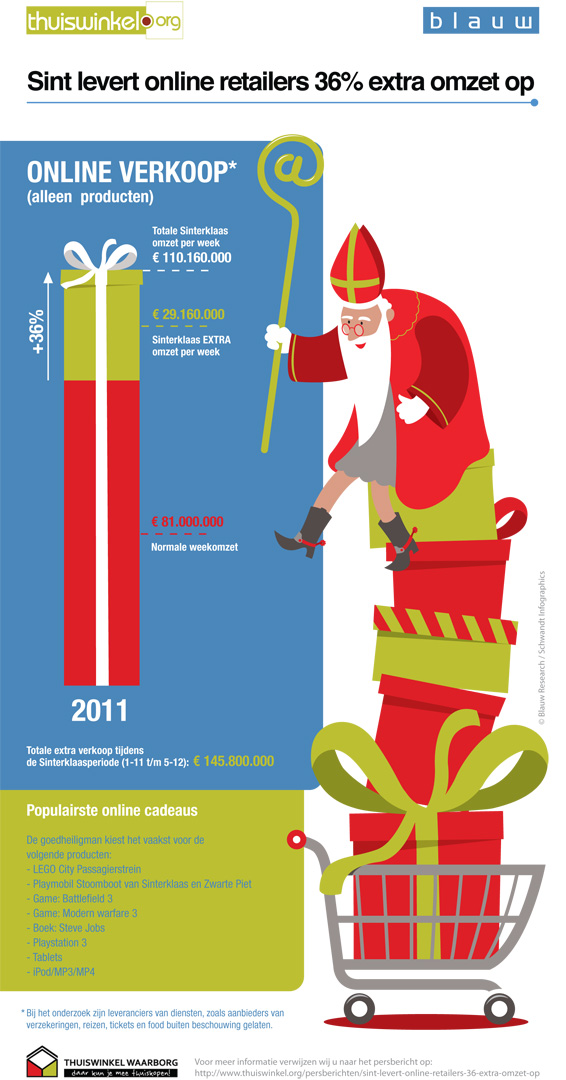 Ook dit jaar zorgt Sinterklaas voor een extra boost in de omzet (+36%) bij online webwinkels. Dat blijkt uit onderzoek van Thuiswinkel.org en Blauw Research (n=1.500 webwinkels). In de periode van 1 november tot en met 5 december verwachten de Nederlandse webwinkels een omzet van € 110 miljoen per week. In de periode voor Sinterklaas was de omzet van de online retailers nog € 81 miljoen per week. De komst van de goedheiligman brengt daarmee, ondanks de daling in het consumentenvertrouwen, een extra omzet van € 29 miljoen per week in het laatje van de webwinkels. In totaal is deze sinterklaasperiode € 146 miljoen euro via internet uitgegeven aan sinterklaascadeaus.
