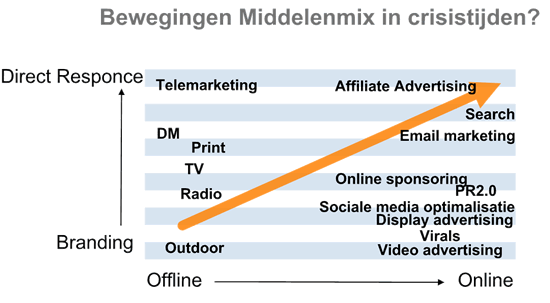 De uitkomsten van de jaarlijks terugkerende onderzoeksrituelen naar waar marketeers hun euro aan gaan besteden lijkt de trend van andere onderzoeken te bevestigen. Het is conversie gericht adverteren wat de klok slaat. Juist door de crisis verschuift de uitgave van offline naar online en van branding naar conversie gericht adverteren. Ik schreef er zelf ook over Kredietcrisis goed voor zoekmachine optimalisatie? en maakte dit plaatje voor een presentatie voor keukenfabrikanten.