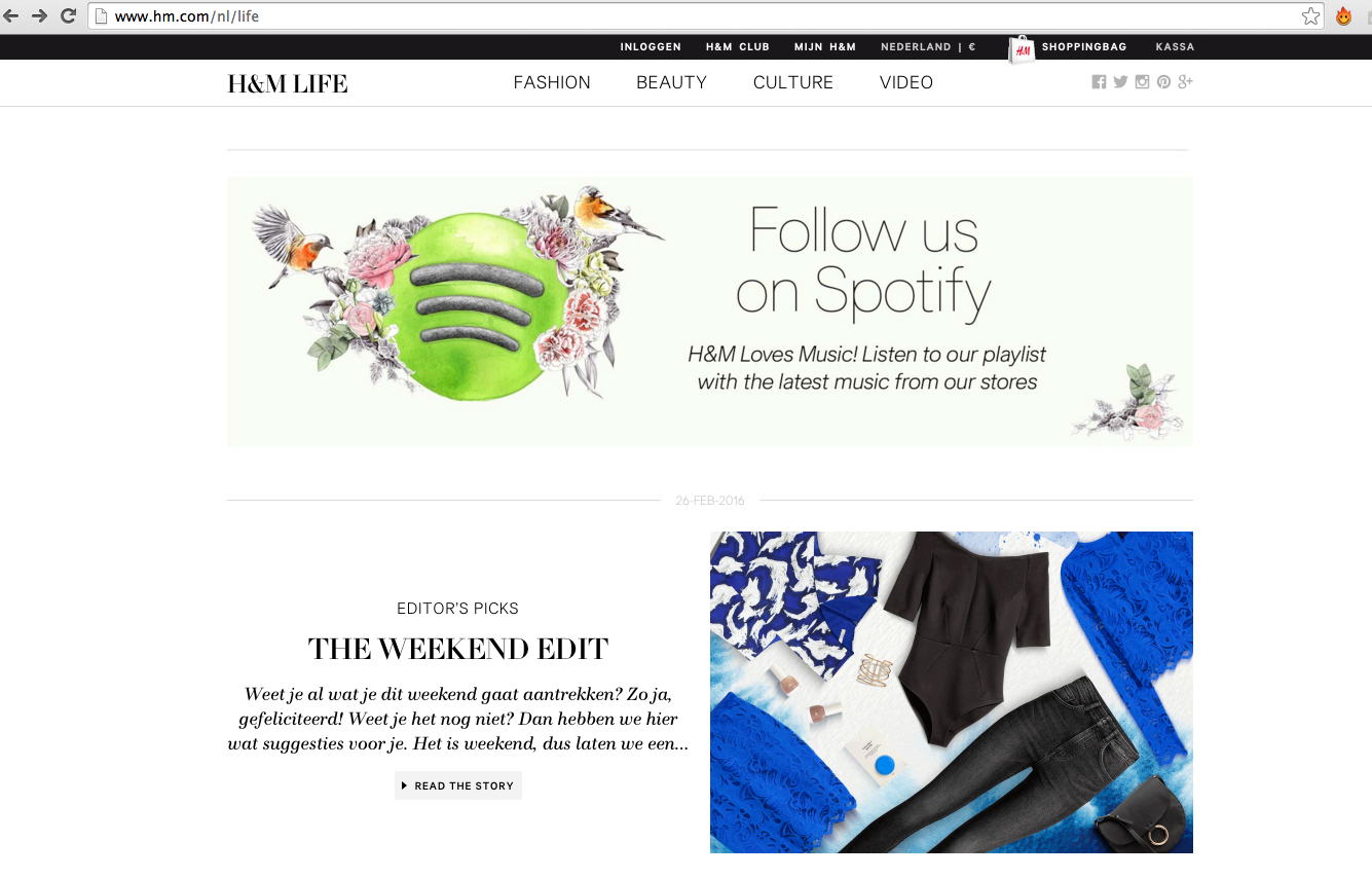 Door verschillende contentvormen toe te passen hou je de aandacht van de doelgroep vast en kun je meer diepgaande informatie aanbieden. Een blogpost kun je eens vervangen door een video waarin de boodschap verder wordt uitgediept. De contentpagina van H&M staat vol met verschillende soorten content: gif’jes, blogs, video’s, fotoverslagen, afspeellijsten van Spotify en meer.