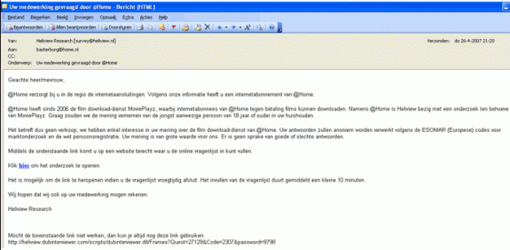 En dat er in de mailing een url zit die verwijst naar een landingspagina van Heliview, dat kan je uitleggen en dat is dan ook prima. Even los van het feit dat de gemiddelde ontvanger Heliview niet zal kennen, kan dit dus worden aangemerkt als SPAM. En ten behoeve van de resultaten –in dit kader het aantal ingevulde enquêteformulieren- zal een afwijkende afzendnaam niet goed werken. Ook niet goed aan de uitnodiging is dat helemaal niet wordt uitgelegd wie Heliview is. Nogmaals, de gemiddelde consument zal dit toch gerenommeerde onderzoeksbureau niet kennen. Dit blijkt wellicht ook uit het feit dat ik ook nog een herinnering ontving voor dit onderzoek.