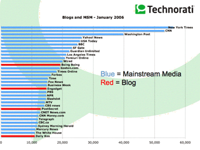 Uitgerekend op het moment dat weblogs de cover van New York Magazine hebben gehaald, blijkt uit de meest recente Technorati update dat de mainstream media weer aan populariteit wint. In de grafiek een weergave van de populariteit van weblogs en mainstream media op basis van het aantal bronnen dat verwijst naar de betreffende media (via: b2day).