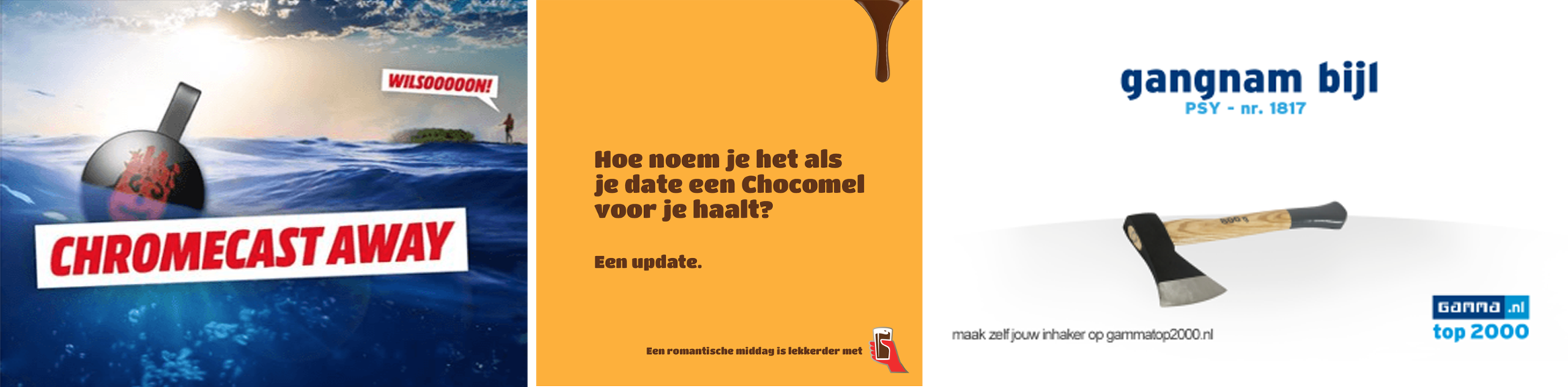 Van de eerder genoemde voorbeelden doet Pickwick het dus het beste, zij zijn de enige met een dubbele woordspeling. Ook met dierendag (“Kat in het bakkie”) lieten zij weer zien dat ze het goed onder de knie hebben. Verder geven ook Heineken met het WK voetbal (“We zullen vanmiddag tot de bodem moeten gaan mannen”) en Husk (“Met wie ga jij vlammen deze winter?”) het goede voorbeeld. Hun woordgrappen met dubbele woordspeling zijn dus niet per sé grappiger dan de woordgrappen van de andere bedrijven welke een enkele woordspeling bevatten.