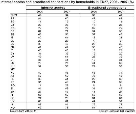 Nederland staat ook aan kop wat betreft het aantal aansluitingen met snel internet, zoals ADSL: 74 procent. In de EU is dat gemiddeld 42 procent. Nederlanders bellen ook vaker dan andere Europeanen via internet. Hier is dat 25 procent tegen 15 procent van de Europeanen. Zelf maken van een website of chatten doen Nederlanders echter amper meer dan andere EU-inwoners.