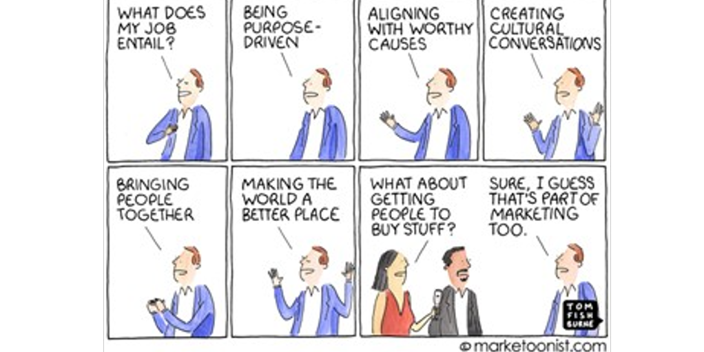 Chris illustreert met onderstaande cartoon van Marketoonist dat marketers het meest cruciale aspect van marketing vergeten lijken zijn: de creatie van producten en services die mensen willen en ook daadwerkelijk kopen – bij voorkeur tegen een steeds hogere prijs.