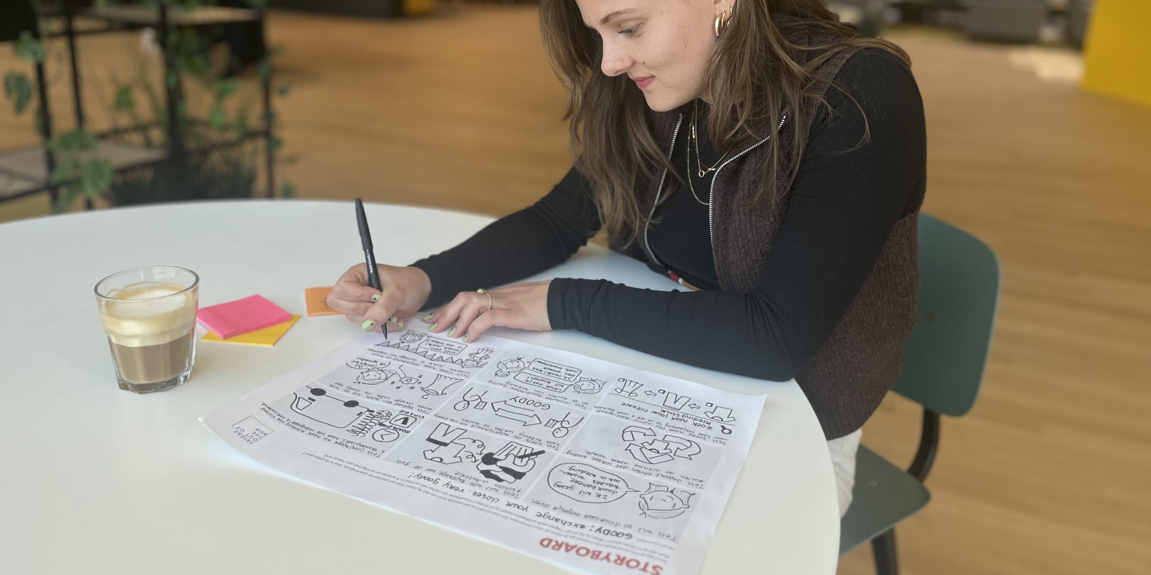 Een goed digitaal prototype vraagt meer details dan je met de solution sketch bereikt. Dus maak je een inspirerend verhaal. Hiervoor creëer ik een storyboard van 9 scènes.