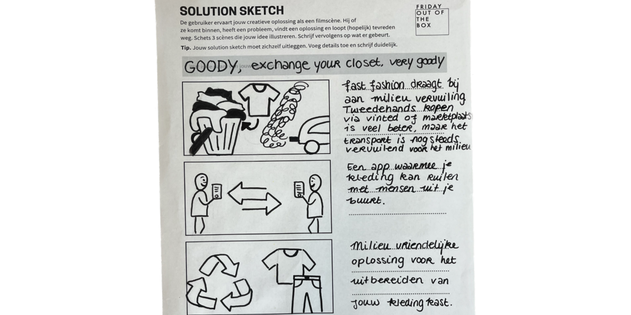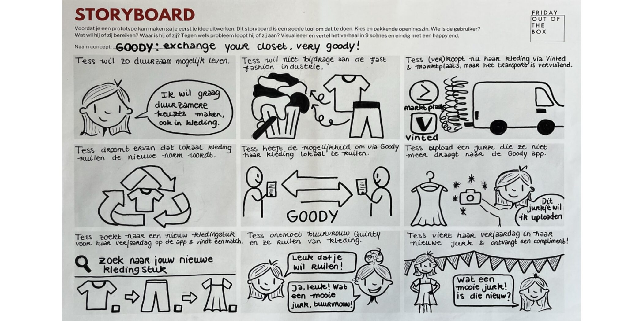 Of afbeelding 2 zie je dat ik een toffe tagline “exchange your closet, very Goody” heb geformuleerd. Daarnaast heb ik in drie scènes het probleem, de oplossing en een happy end geschetst en beschreven. Vanuit het perspectief van de eindgebruiker. Je ziet dat het idee een stuk concreter is geworden.