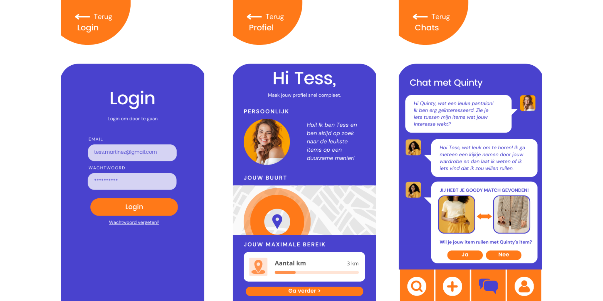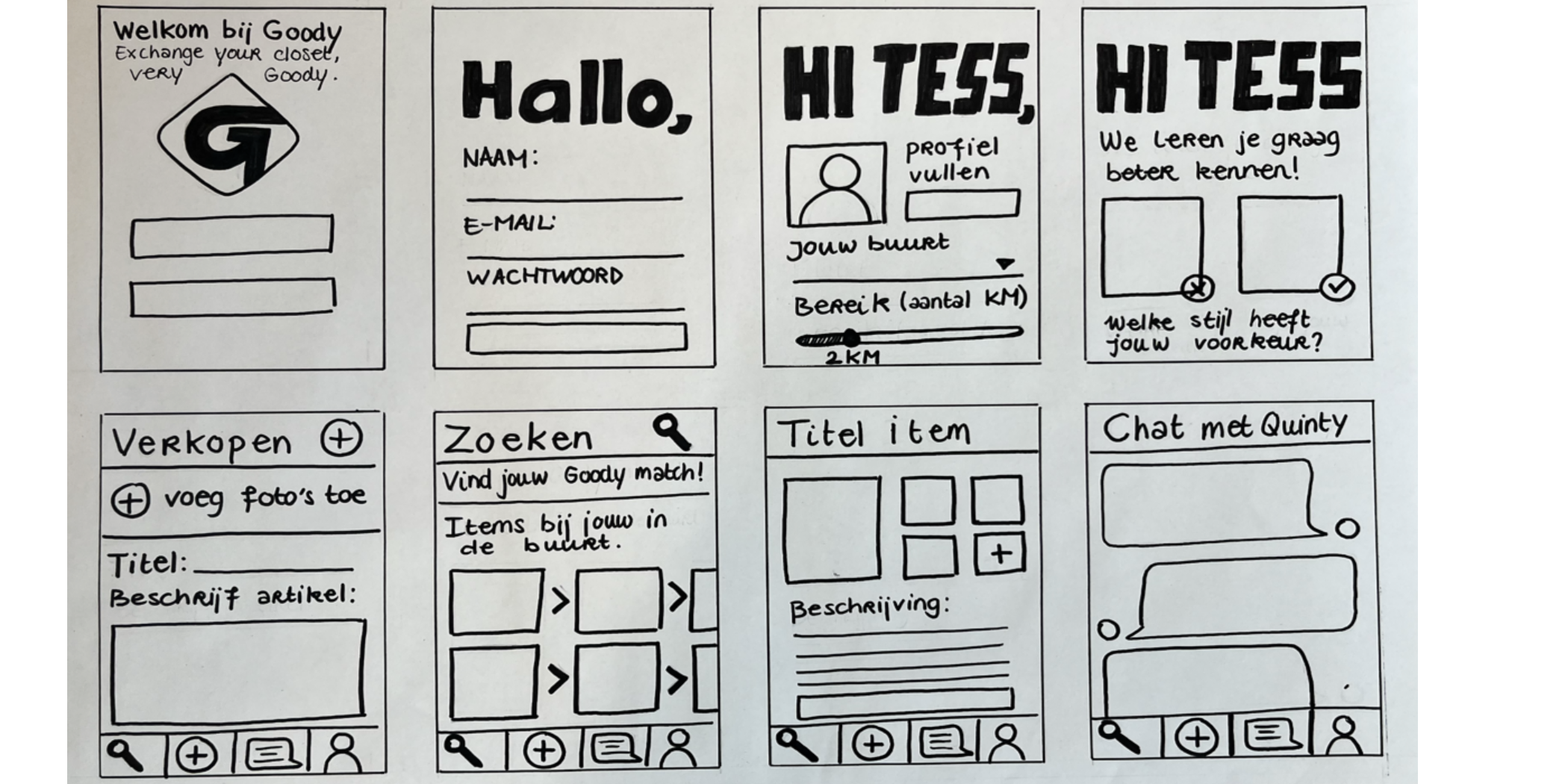 Ik gebruik voor het maken van dit prototype onze eigen fictieve Goody case. Goody is een innovatieve app waarmee je kleding kunt ruilen in je buurt. Het idee achter Goody is dat het doorgeven, verkopen en ruilen van kleding duurzaam is, maar dat de kosten van transport via bijvoorbeeld Marktplaats nog steeds vervuilend zijn voor het milieu. Daarom is ruilen in je eigen wijk nog duurzamer.