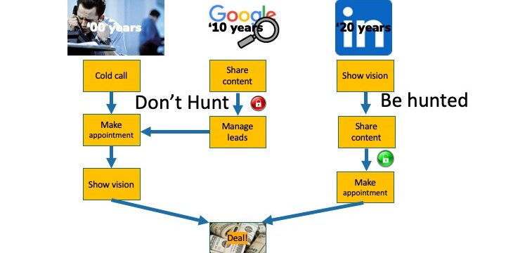 Want dat is ook een interessante evolutie: hoe acquisitie in de loop van de jaren is veranderd. Toen ik laatst deze post zag van Alex B Sheridan ontstond in mijn hoofd onderstaand model. Hij liet een belangrijke evolutie in acquisitie zien: in het verleden deelde hij zijn visie op de markt pas aan tafel bij de klant, tijdens een afspraak die hij met veel moeite moest regelen. Koude acquisitie, om vervolgens ook nog de verwachting te moeten ontkrachten dat je ‘het zoveelste bureau’ bent.