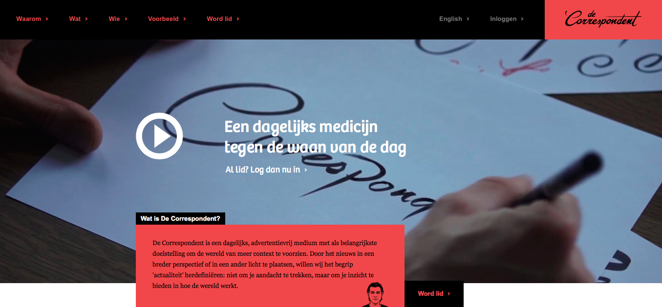 Waarin is de Correspondent verder vernieuwend? Even afgezien van het groeimodel en de inhoud? Veel, zo blijkt! Vooral het niet voeren van advertenties is denk ik essentieel. De gevestigde orde lijkt dat onbelangrijk te vinden, ze hebben immers een onafhankelijke redactie? Met wat googelen merk je dat zij er moeite mee hebben zichzelf als anders te beschouwen en de kracht en relaxtheid van advertentieloos te waarderen. Zo stelt Volkskrant-redacteur Maarten Keulemans stelt in zijn artikel ‘Vernieuwers bij ‘de Correspondent’ gewoon gevestigde elite’ simpelweg: