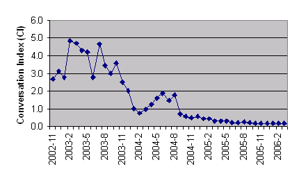 Aardig is overigens om te zien dat het bijna 2 jaar heeft geduurd voordat er op Marketingfacts pas echt sprake was van een conversatie. Vanaf september 2004 kent Marketingfacts structureel een CI lager dan 1,0.