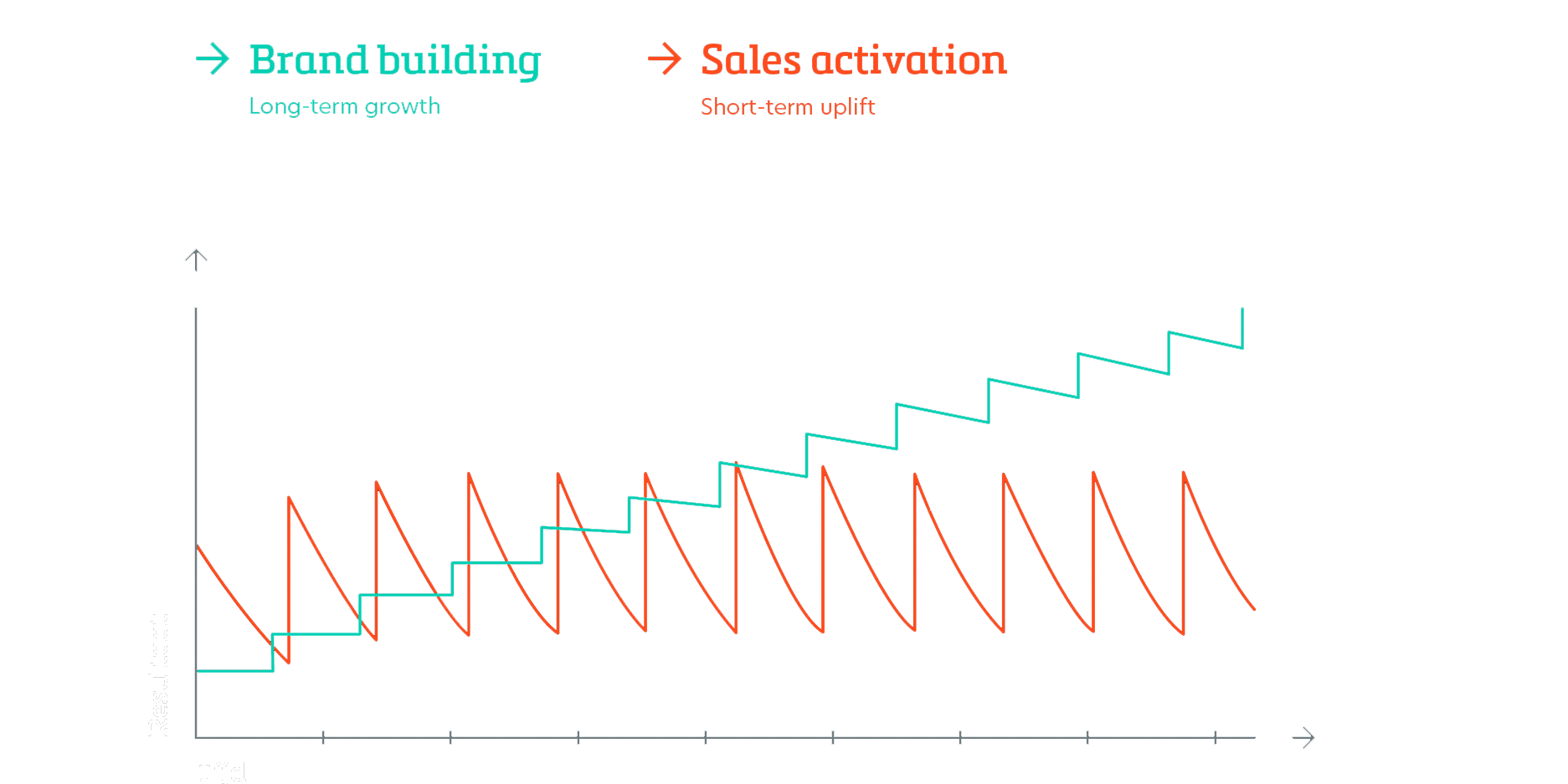 Wie meer wil weten over hoe brand building en activatie werken, verwijzen we graag naar ‘The long and the short’ van Field en Binet. ‘The long’ staat daarbij voor bouwen aan je merk op de lange termijn, ‘the short’ voor activatie van de doelgroep. Field en Binet analyseerden 996 campagnes van 700 merken. Hun belangrijkste ondervinding: