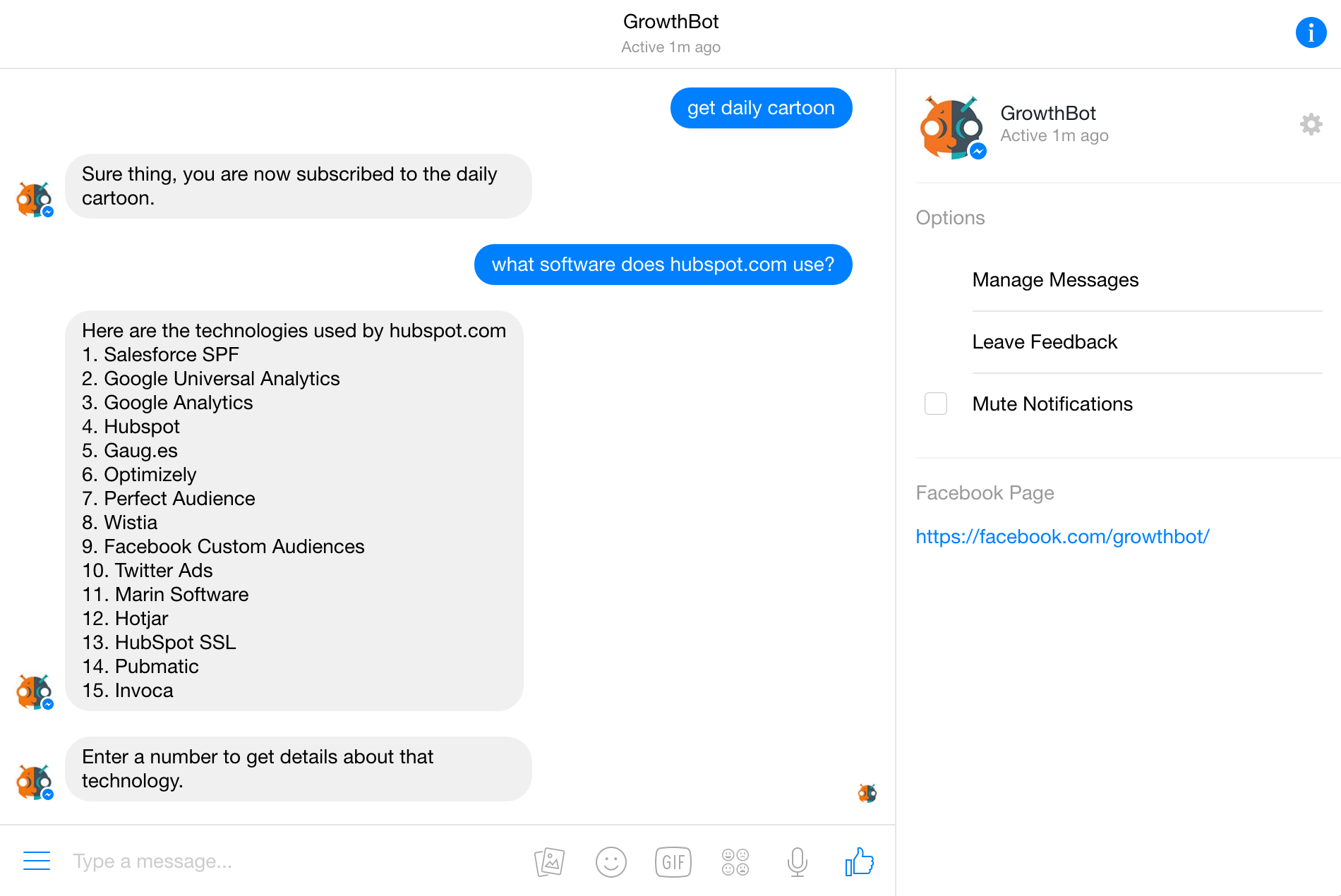 Growthbot is een side-project van Dharmesh Shah, oprichter en cto van HubSpot. Hij was op zoek naar een handige marketingbot en besloot om er maar zelf een te bouwen. Via verbindingen met bronnen als HubSpot en Google Analytics kan Growthbot interessante antwoorden geven direct vanuit Slack, Facebook Messenger, en zelfs Twitter. Vragen als “What software does Userlike.com use?“, “What is trending on Inbound.org?” of “What keywords does Marketingfacts.nl rank for?“.