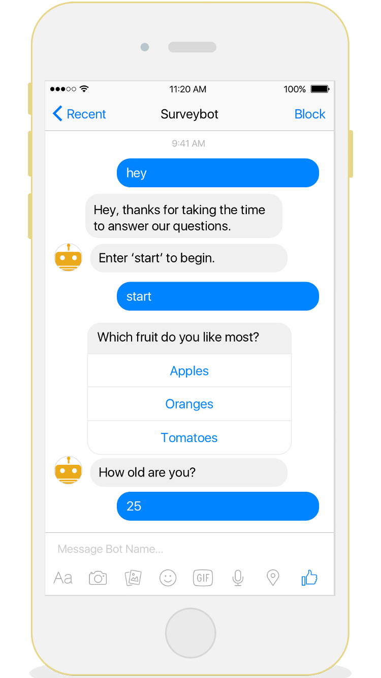Door het opzetten van vragen binnen Surveybot en deze te verbinden aan je Facebookpagina, kunnen ondervraagden je survey beantwoorden via hun favoriete messaging-app. Begin met het maken van beter geïnformeerde besluiten en stop met het spammen van je doelgroep via e-mailsurveys!