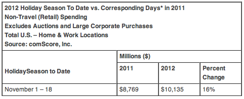 “comScore reported holiday season retail e-commerce spending for the first 18 days of the November – December 2012 holiday season, as well as its official spending forecast for the season. For the holiday season-to-date, $10.1 billion has been spent online, marking a 16-percent increase versus the corresponding days last year. Thursday, November 8 has been the heaviest online spending day of the season to date at $829 million.”