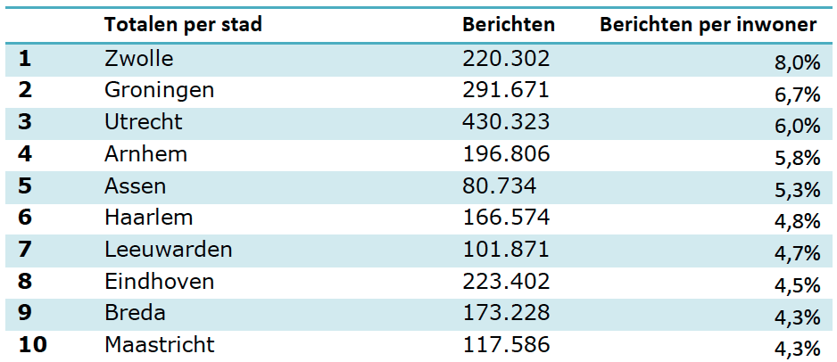 Voor het derde jaar op rij heeft Clipit de online berichtgeving over steden onderzocht. In het onderzoek van vorig jaar kwam Groningen als online meest besproken stad naar boven. Dit jaar is Groningen van zijn troon gestoten door de hoofdstad van Overijssel; Zwolle. Deze sportieve stad heeft niet alleen veel online buzz weten te creëren, maar ook zeer positieve. In het onderzoek wordt er onder andere rekening gehouden met het aantal berichten waarin de stadsnaam wordt genoemd in verhouding tot het aantal inwoners. Daarnaast is gekeken naar de mate van positieve versus negatieve berichten, het soort bronnen waarop geschreven wordt en de waarde die al deze berichten vertegenwoordig voor de stad.