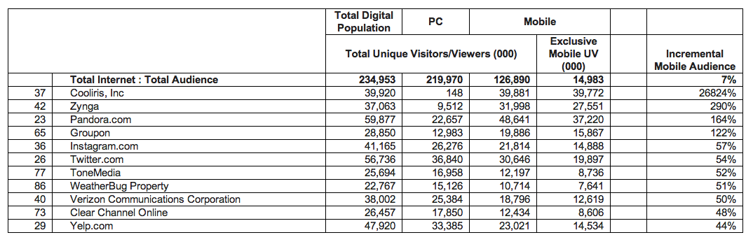 Dit grote gemist lijkt eindelijk voorbij. Op AllThingsD valt te lezen dat comScore eindelijk het bezoek van mobiel en app gaat meenemen. comScore voegt de cijfers samen zodat je als platform je feitelijk aantal unieke bezoekers kunt inzien. Dus als je zowel op je pc facebook.com bezoekt als de app gebruikt in november dan tel je als 1 unieke bezoeker.