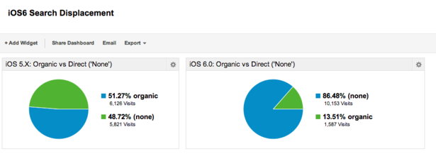 Niet alleen Apple Maps zorgt sinds iOS 6 voor hoofdpijn. Met de update van het besturingssysteem worden nu alle zoekopdrachten via Apple devices via https verstuurd. Het resultaat is dat het referral verkeer van iOS 6 gebruikers niet meer terug te herleiden is. Mogelijk organisch zoekverkeer wordt daardoor nu aangemerkt als 'direct verkeer'. Uit statistieken van Econsultancy.com blijkt dat het organisch zoekverkeer 51% uitmaakt bij iOS5 gebruikers, tegenover 14% voor iOS6.