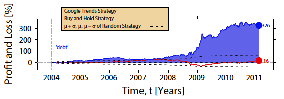 Het is mogelijk de beurskoersen te voorspellen door zoekopdrachten in Google te analyseren. Dat hebben de wetenschappers Tobias Preis, Helen Susannah Moat en H. Eugene Stanley in dit onderzoek vastgesteld. Dit zijn dezelfde onderzoekers die een paar jaar eerder aantoonden er een relatie bestaat tussen het aantal zoekopdrachten en het aantal transacties.