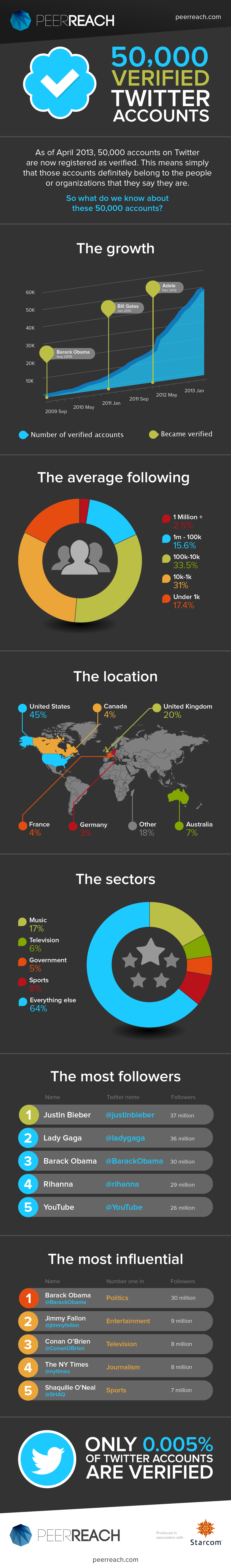In 2009 startte Twitter met het uitdelen van een stempel van echtheid (de bekende blauwe verificatie badge) aan Twitter accounts, om échte accounts te kunnen onderscheiden van fake en parodie accounts. Sinds vorige week zijn er meer dan 50.000 geverifieerde accounts. Samen met PeerReach maakte StarCom deze infographic met o.a. de groei, de locatie, de meest populaire groepen en de meest populaire geverifieerde accounts.