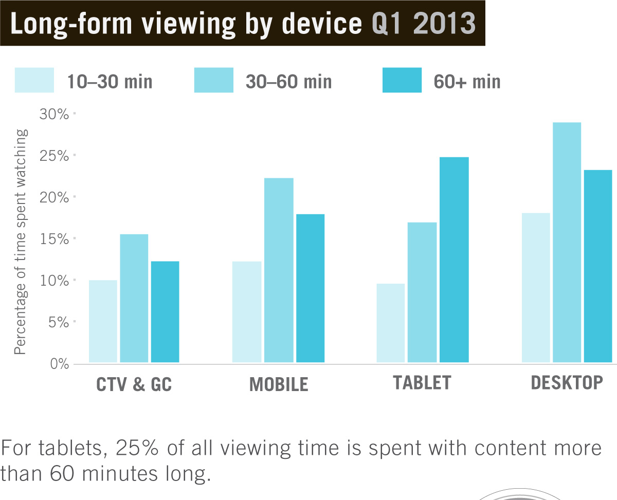 “Veranderingen gaan langzaam en dan ineens zijn ze een feit”. Met die openingszin gepubliceerde Ooyala gisteren de nieuwste editie van haar onderzoeksrapport 'Global Video Index Q1/2013'. De resultaten betreffen het (online) videokijkgedrag van 200 miljoen unieke gebruikers in meer dan 130 landen.