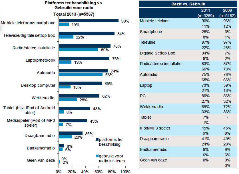 Er zijn diverse platforms waarop radio kan worden beluisterd. Naast het traditionele radiotoestel is dat onder meer: via de PC (internet), via de digitale settop box, mobiele telefoon/smartphone, tablet mp3 speler, iPod, digitale televisie, autoradio, etc. Het platformonderzoek geeft inzicht in het gebruik van deze platforms. Omdat dit onderzoek in 2009 en 2011 ook heeft plaatsgevonden, geeft het bovendien inzicht in de trends in het gebruik van de platforms. Hierbij zal in het speciaal worden ingezoomd op het gebruik van internet als transmissieplatform.