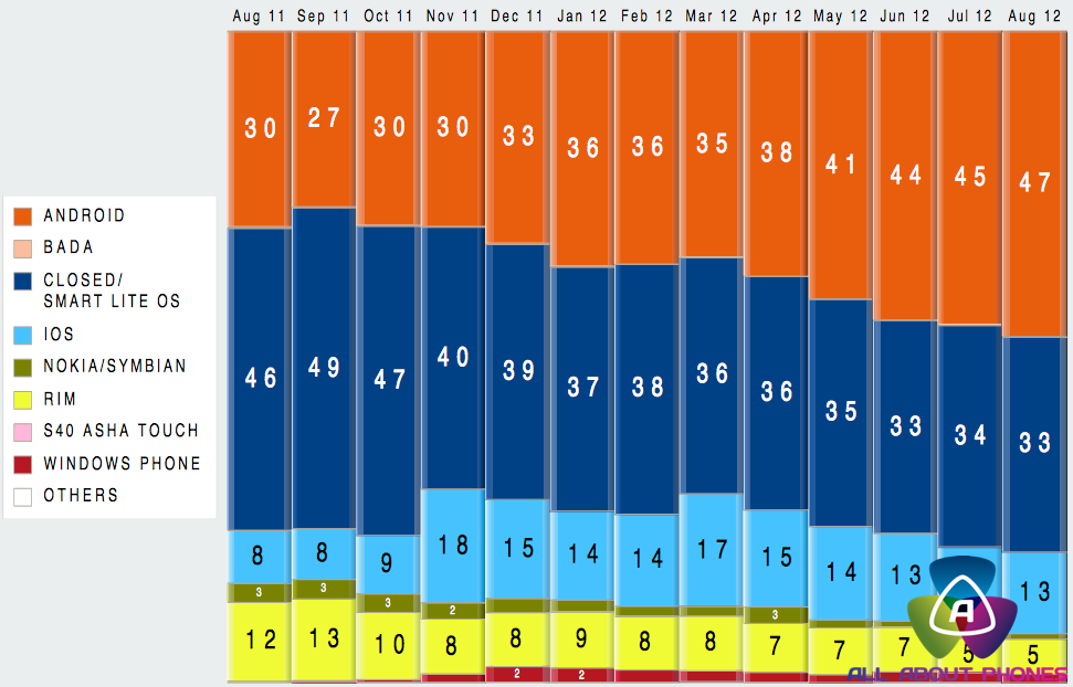 Het aandeel van Android van alle verkochte telefoons in Nederland is in een jaar tijd gegroeid 30 naar 47 procent, zo blijkt uit cijfers van GfK die All About Phones naar buiten heeft gebracht. Opvallend is dat de 33% van alle verkochte telefoons in Nederland nog altijd een 'ouderwetse' feature phone is. Het aandeel iPhone stond in augustus op 13%.