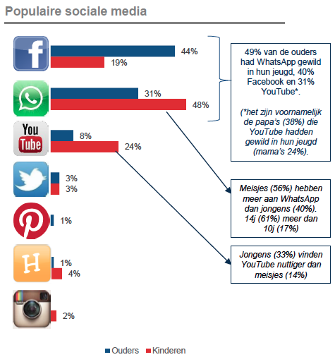 Ouders willen zien waar hun kind op social media mee bezig is (74%) en met wie hij/zij omgaat (49%). Desondanks zijn ouders van kinderen tussen 10 en 14 jaar oud positief over het gebruik van sociale media door kinderen. Ze vinden dat het gebruik een positief effect kan hebben op de Engelse taalvaardigheid (56%) en op de communicatievaardigheden (48%) van hun kinderen. Daarnaast zien ouders kansen in het delen van informatie (71%) en in het maken en delen van huiswerk (62%). De meeste kinderen weten dat ze door hun ouders worden gevolgd op sociale media (71%). Een op de drie ouders reageert ook op berichten van hun kind op social media.