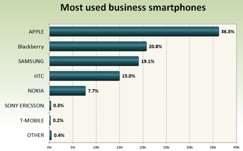 Na de consumentenmarkt is nu ook op de markt voor zakelijke smartphones de ommekeer in gebruikte merken duidelijk zichtbaar. Ruim een derde van de zakelijke smartphones die momenteel in gebruik zijn bij Nederlandse commerciële en publieke instellingen betreft een iPhone. Een jaar geleden was dat nog een kleine 28 procent. Samsung manifesteert zich steeds nadrukkelijker als een geduchte concurrent op de zakelijke markt. In september 2011 bedroeg het aandeel Samsung smartphones nog een kleine 2 procent. In 12 maanden tijd heeft Samsung dit voor de Nederlandse zakelijke markt, onder aanvoering van de Galaxy S modellen, weten uit te breiden tot een aandeel van 14 procent. Samsung heeft deze stijgende lijn vast weten te houden en noteert in 2013 een aandeel van 19 procent. Dit blijkt uit circa 1.600 interviews onder Nederlandse bedrijfsvestigingen met 50 of meer werknemers.
