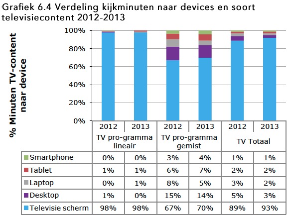 Steeds meer Nederlanders bekijken via smartphone en tablet video. Bijna de helft van de Nederlanders van 13 jaar en ouder (48 procent) kijkt wel eens videomateriaal op een smartphone en ruim een derde (36 procent) kijkt wel eens videomateriaal op een tablet. Aan de hand van dit onderzoek monitort SKO de trends in het gebruik van smartphones, tablets, desktops, laptops en het TV scherm voor het bekijken van audiovisueel materiaal.