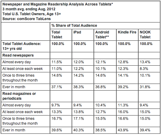Uit onderzoek van comScore blijkt dat 2 op de 5 Amerikaanse tableteigenaren kranten en/of magazines lees op hun tablet. 1 op de 10 leest deze zelfs dagelijks. Eigenaren van een Kindle Fire zijn de meest actieve krantenlezers.
