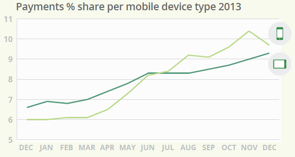 Mobiele betalingen vertegenwoordigden in december 2013 19,5% van alle wereldwijde transacties. Dit betekent een groei van 55% jaar-op-jaar en een stijging van 12,6% ten opzichte van december 2012. Tablets genieten bij consumenten de voorkeur voor het uitvoeren van betalingen met een hogere waarde. Daarmee verslaan ze smartphones en in sommige gevallen zelfs PC’s.