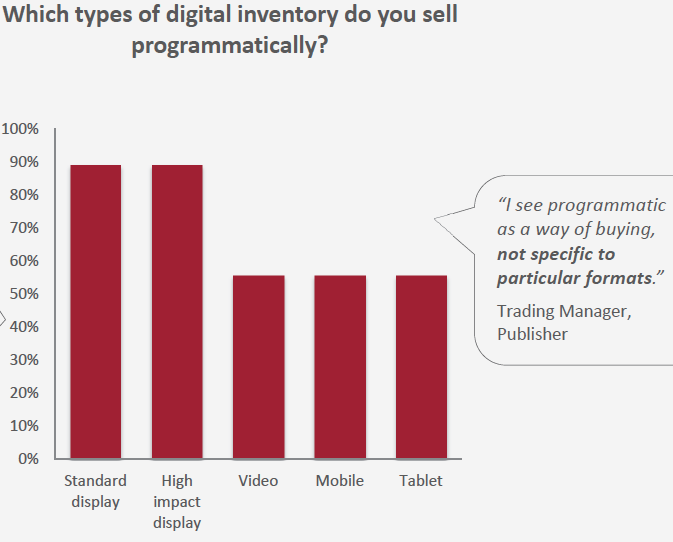 Er is vertrouwen onder uitgevers in Nederland dat de programmatic verkoop zal blijven groeien, en dat het programmatic verkoop model, het model van de toekomst is. Programmatic advertising betreft het automatisch in en verkopen van media ruimte middels een veiling, in de volksmond ook wel RTB genoemd. Momenteel haalt 38% van de uitgevers hun inkomsten uit programmatic. Uit dit onderzoek blijkt dat 75% van de uitgevers verwacht dat de helft van hun inkomsten binnen een jaar via programmatic zal lopen.