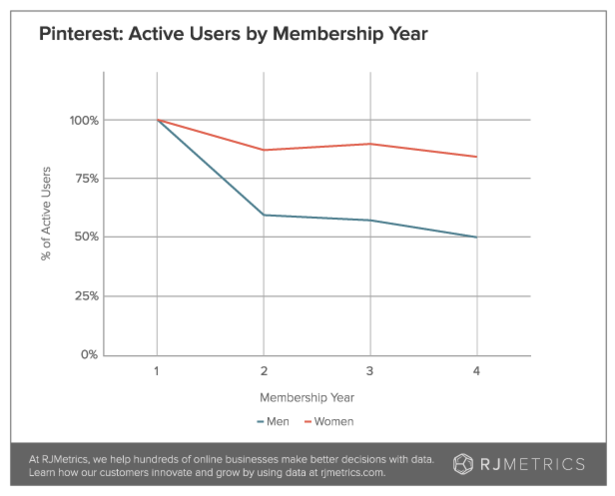 RJMetrics heeft een sample van 50.000 willekeurige Pinterestgebruikers geanalyseerd. Hieruit blijkt dat nog altijd 80 procent van de Pinterestgebruikers vrouw is, en dat 84 procent van de vrouwen nog altijd actief zijn in het 4e jaar van hun lidmaatschap. Bij mannen neemt de activiteit echter veel sneller af.