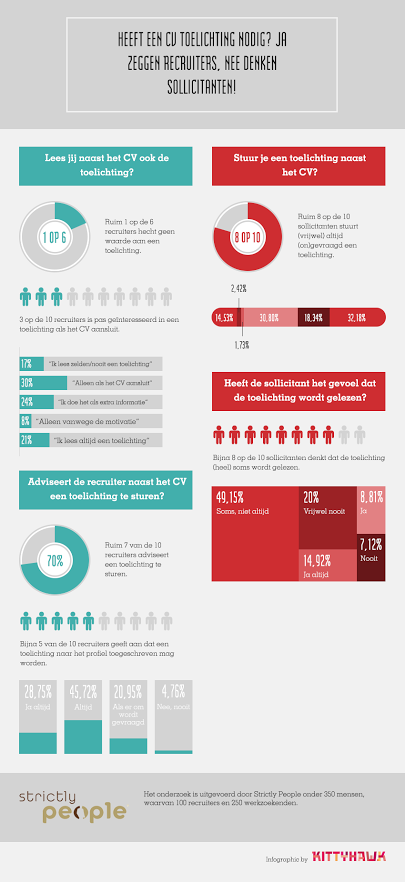 Ruim 8 van de 10 recruiters zegt bij een goed cv de toelichting te lezen, terwijl bijna 8 op de 10 sollicitanten denkt dat een toelichting niet wordt gelezen. Strictly People heeft een onderzoek gehouden met als doel helderheid te krijgen in wat een recruiter wil en wat het gevoel is dat de kandidaat krijgt met betrekking tot de cv en haar toelichting/motivatie. Meer dan 350 mensen, waarvan 100 recruiters, hebben meegewerkt aan het onderzoek.