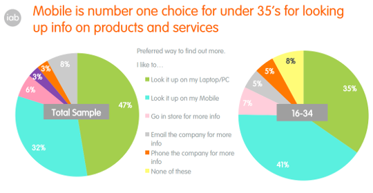 Onderzoek van IAB en Kantar Media toont aan dat mobiel voor 16-34-jarigen de belangrijkste bron is van het vinden van productinformatie. Op de vraag welke bronnen ze gebruiken om productinformatie te vinden zei 41 procent mobiel, 35 procent laptop/PC en 7 procent fysieke winkels.