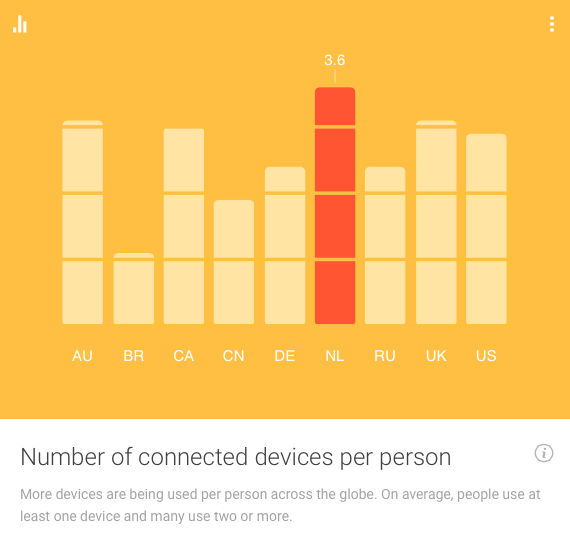 De Consumer Barometer is een fantastische datavisualisatietool van online consumentengedrag. Google heeft deze tool onlangs een update gegeven met data uit 2014 van maarliefst 46 landen. Zo laat het onder andere zien dat Nederlanders gemiddeld de meeste devices (3,6 per persoon) hebben. Daarnaast vind je er onder andere cijfers over internetgebruik, socialmediagebruik, online winkelgedrag en nog veel meer.
