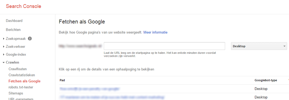 In Google Search Console is het ook mogelijk om de nieuwe HTTPS URL’s te fetchen als Google. Gebruik de belangrijkste URL’s van de website en haal deze op met behulp van deze tool. Dit geeft een extra stimulans aan een snelle indexatie van de nieuwe pagina’s.