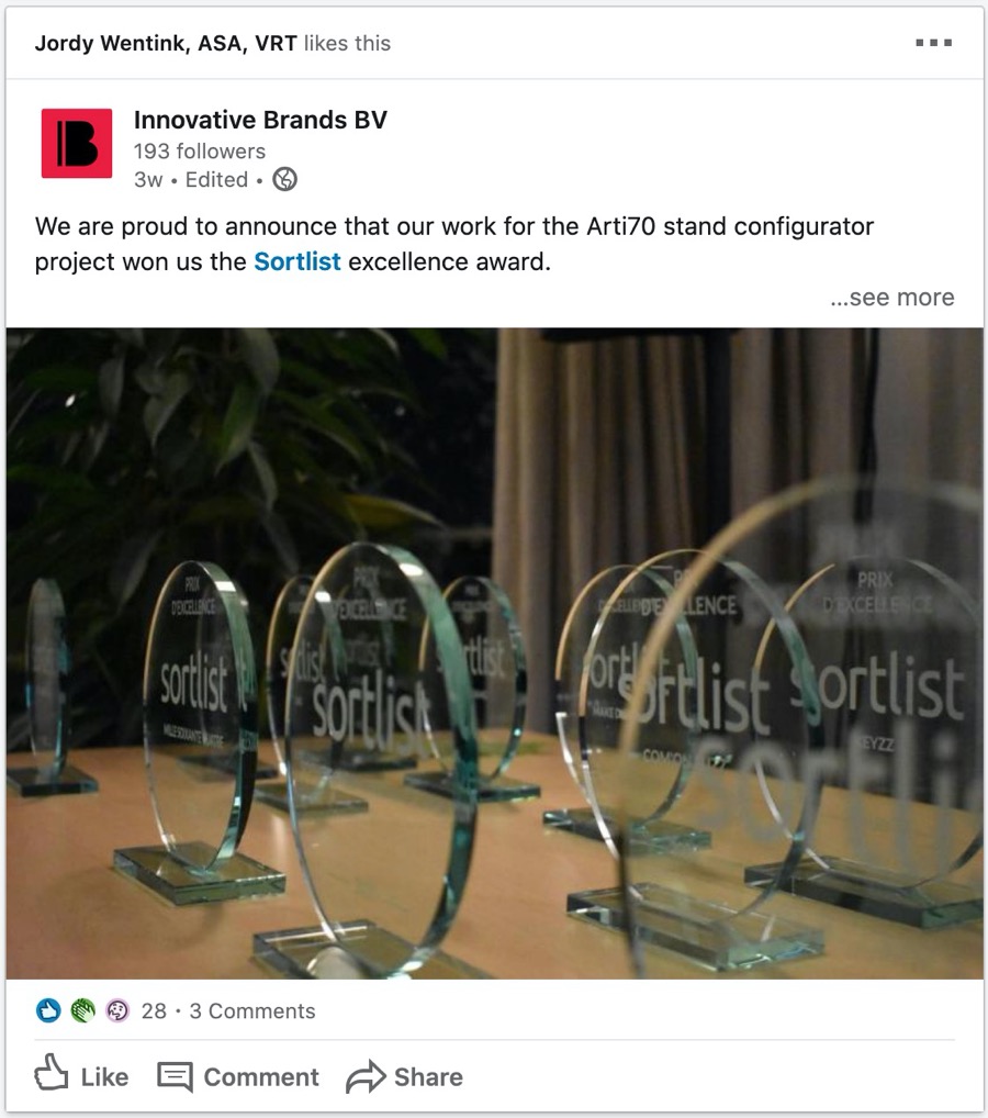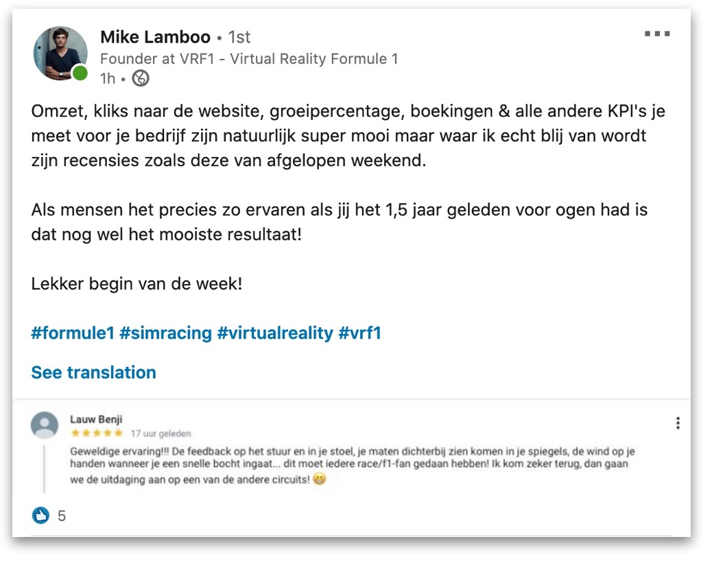 Alles wat je op LinkedIn over je bedrijf plaatst, doe je op de Company Page. Heeft je die pagina nog maar weinig volgers en dus weinig engagement? Dat is geen ramp, want als je met je eigen account een comment zet op die post dan, verschijnt de gehele post ook op je eigen tijdlijn. Afhankelijk van je netwerk zorgt dit voor duizenden views op de post, waarvan een klein percentage je bedrijf mogelijk gaat volgen.