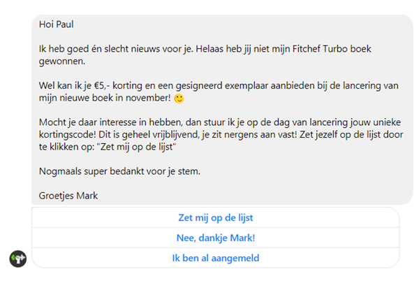 Daarna stuurden wij ze zeven dagen later een bericht met betrekking tot de pre-orderactie: schrijf je in en krijg een gesigneerd exemplaar + 5 euro korting.