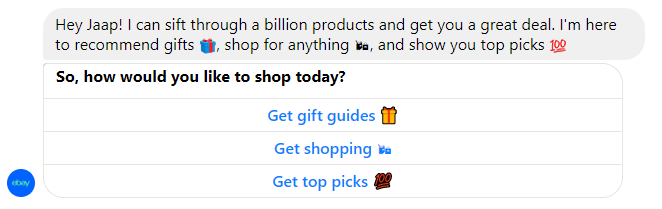 eBay heeft een mooi voorbeeld van een e-commerceoplossing. Via de eBay Shopbot kun je via de Facebook Messenger op zoek naar producten en uiteindelijk ook bestellen en afrekenen.