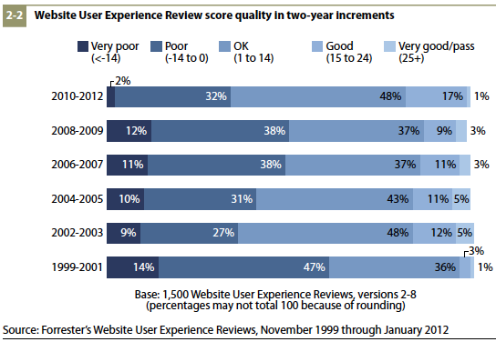 Uit langdurig onderzoek van Forrester naar de user experience van meer dan 1.500 websites gedurende de afgelopen 12 jaar blijkt dat er slechts een handjevol websites goed scoort. Slechts 3% van de onderzochte sites scoorde gedurende 1999 – 2012 goed op gebruikerservaring. Dat komt neer op slechts 45 websites. Opvallend is dat de kwaliteit van de websites de afgelopen 2 jaar wel flink is toegenomen. 66% van de website scoort goed of hoger.