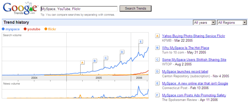 Moet eerlijk zijn dat ik hier al heel lang op heb zitten wachten: Google Trends. Een tool waarmee het mogelijk is om de populariteit van een zoekopdracht in een bepaalde tijdsperiode te analyseren. Het is tevens mogelijk om een vergelijking te maken voor meerdere zoekopdrachten. Aardig is dat voor de pieken in de grafiek extra informatie beschikbaar is. Google Trends is gebaseerd op het reeds langer beschikbare Google Zeitgeist (via: Googleblog).